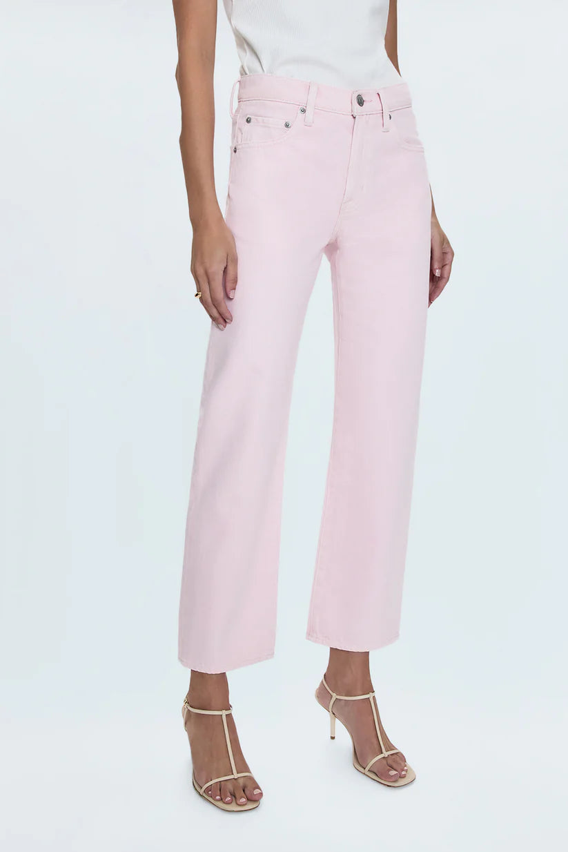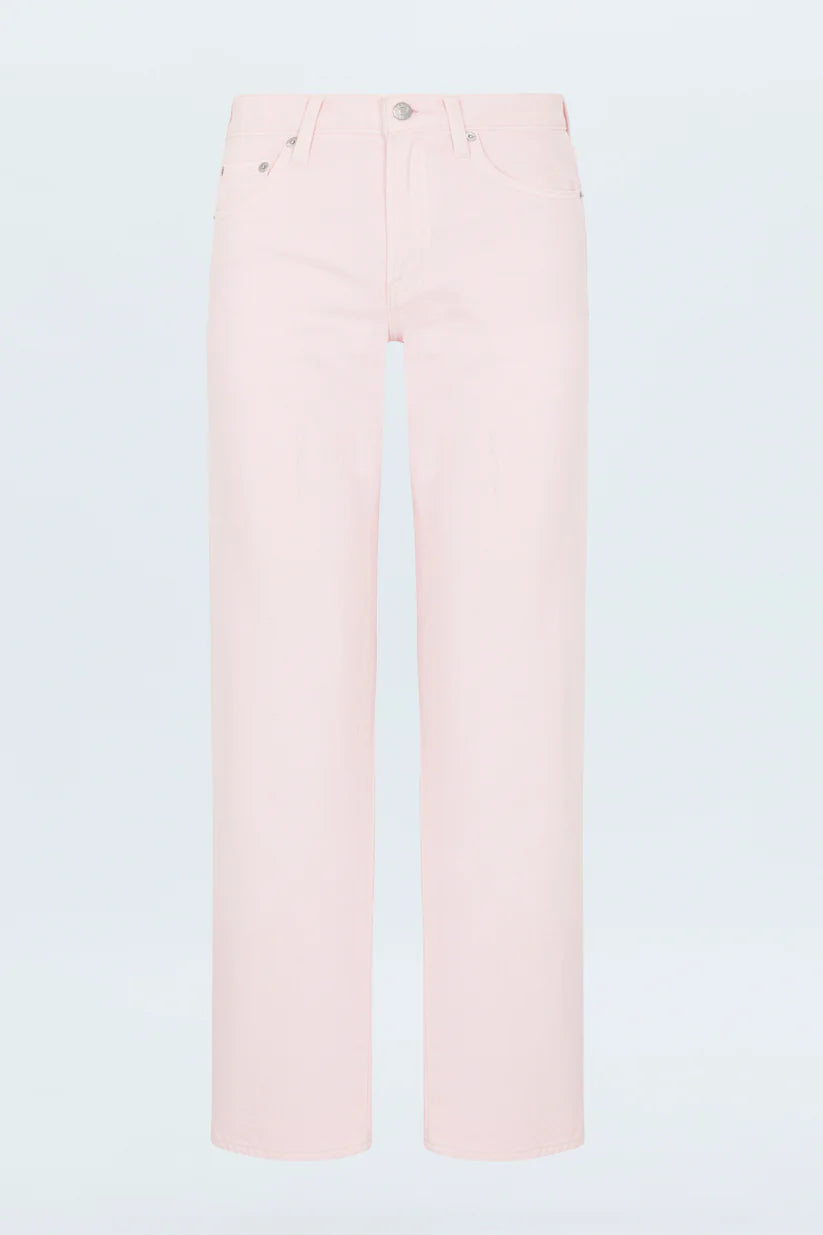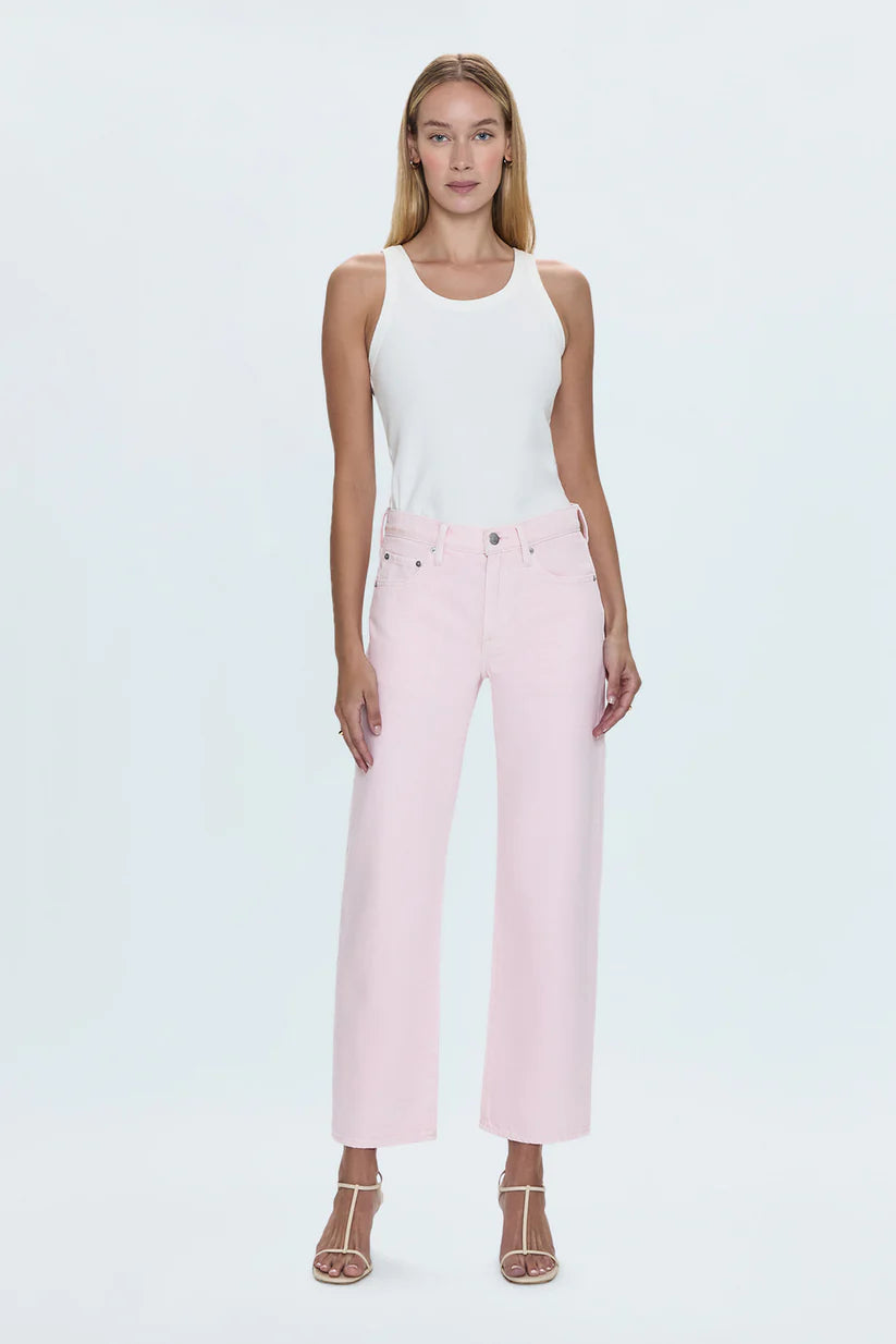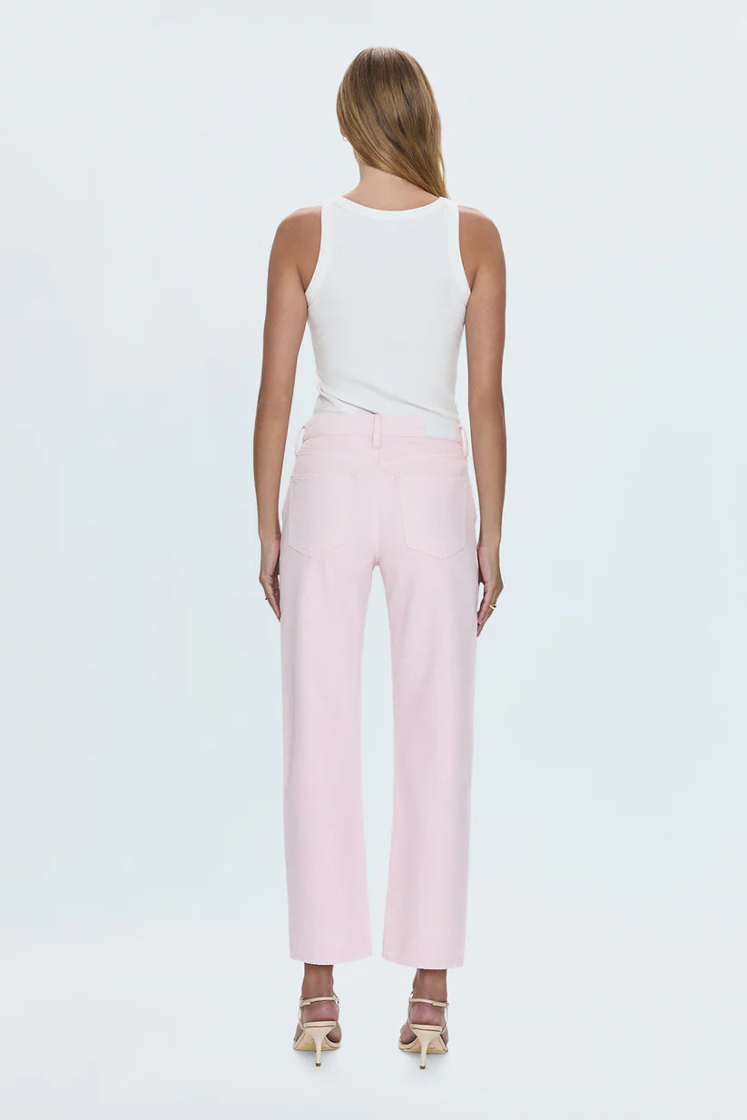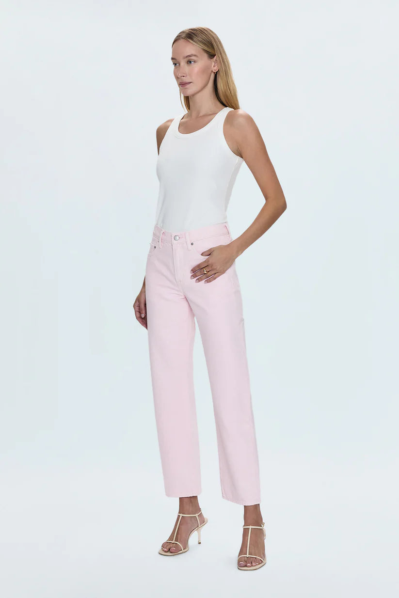 Meet your new favorite jeans. Designed with a flattering mid-rise and a unique bowed leg silhouette, these jeans offer a modern twist on a classic style. The straight leg is subtly bowed at the knees, creating a gently arched shape that's both comfortable and chic.  In our soft Blush pink denim, these jeans add a touch of feminine color to your wardrobe.  The cropped ankle length and clean hem make them perfect for showcasing your favorite shoes.