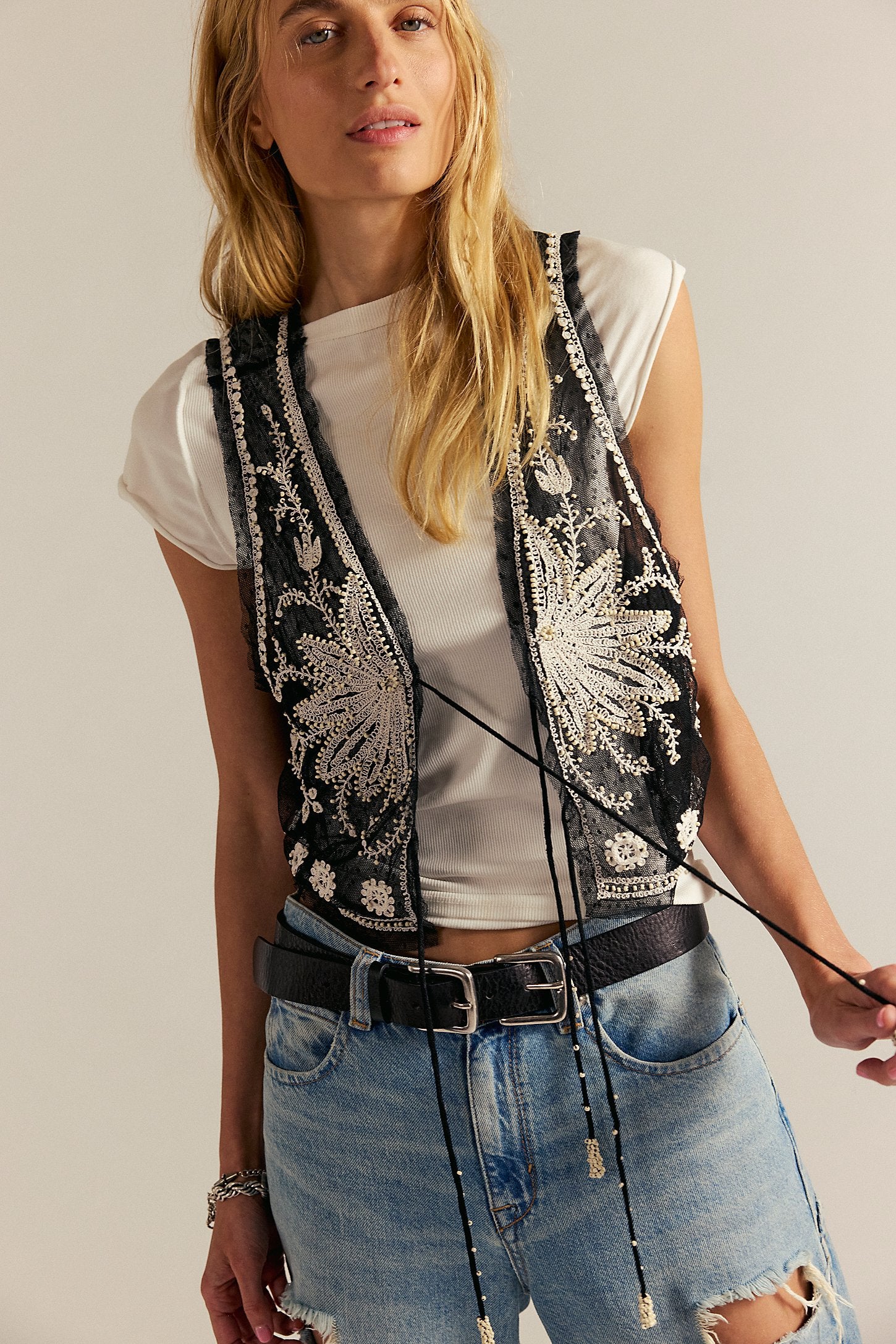 So dreamy and delicate, this vest features a semi-sheer tulle fabrication, stunning embroidered details, and a tie-front closure for the perfect elevated layering piece.