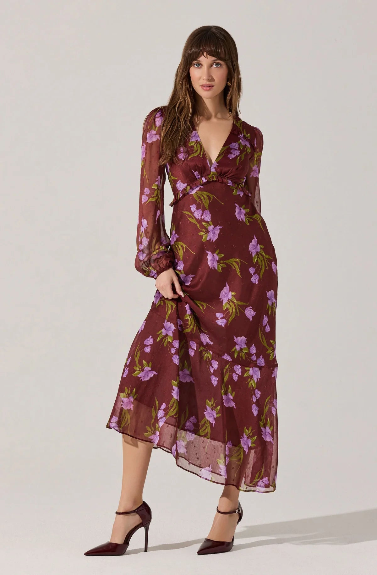 Delicate ruffle trim adds texture and a touch of romantic charm to this maxi length floral dress. Perfect for weddings, fancy dinners, or any occasion where you want to feel beautiful without trying too hard.