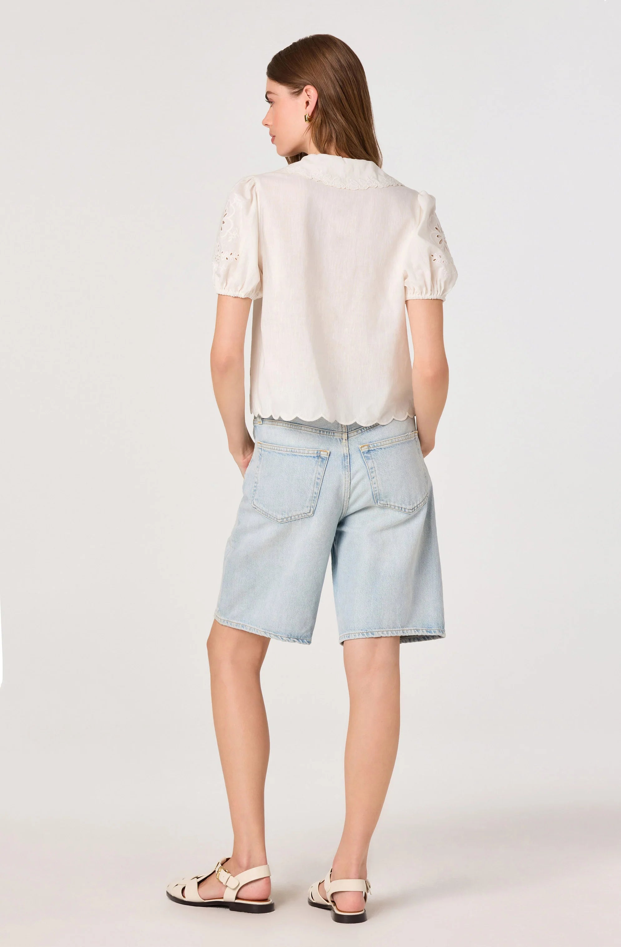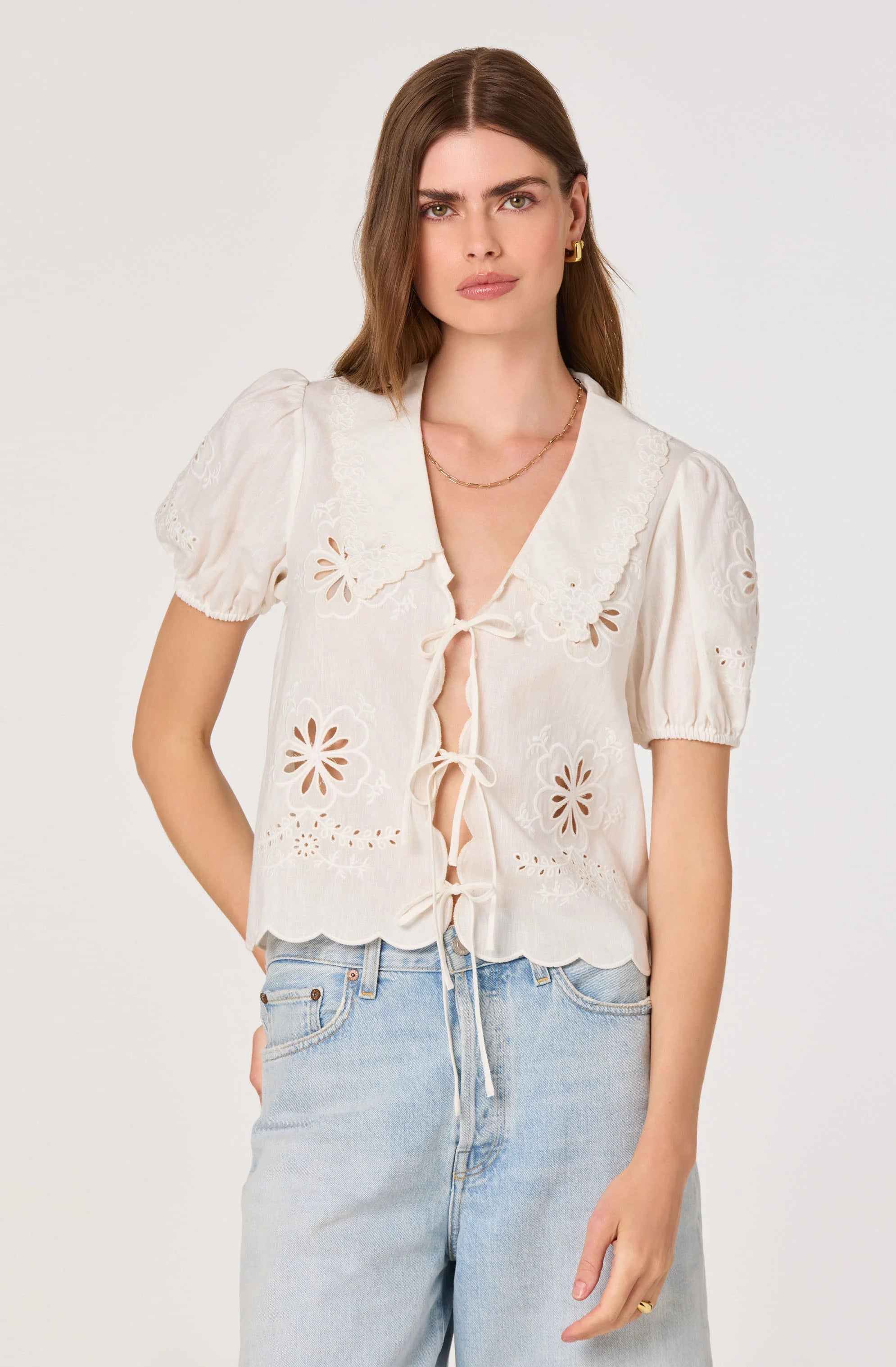 Intricate floral embroidered cutwork creates romantic beauty in this semi-sheer linen top. The self-tie closures and open-front design offer versatile styling, while puff sleeves with elastic cuffs add feminine volume.