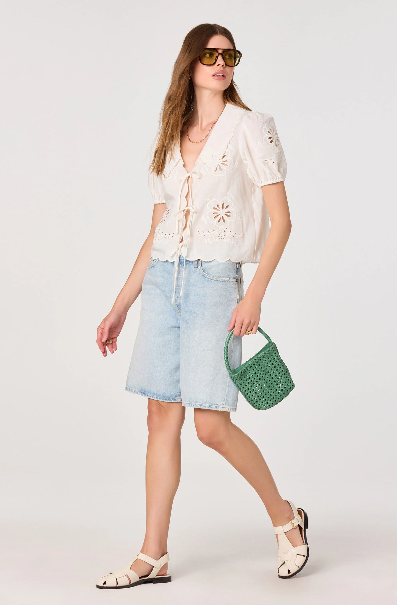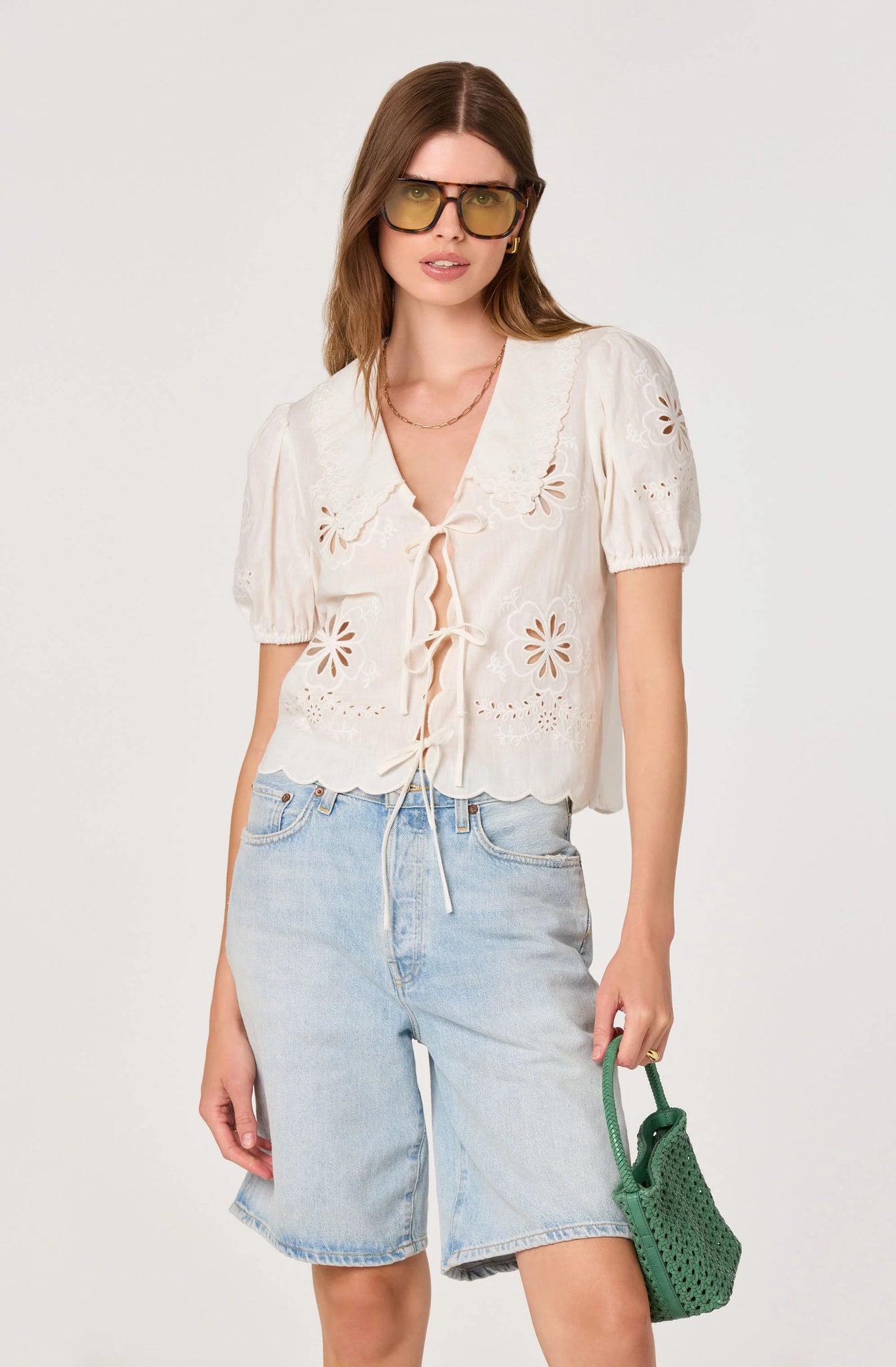 • Deep V-neckline with embroidered scalloped collar