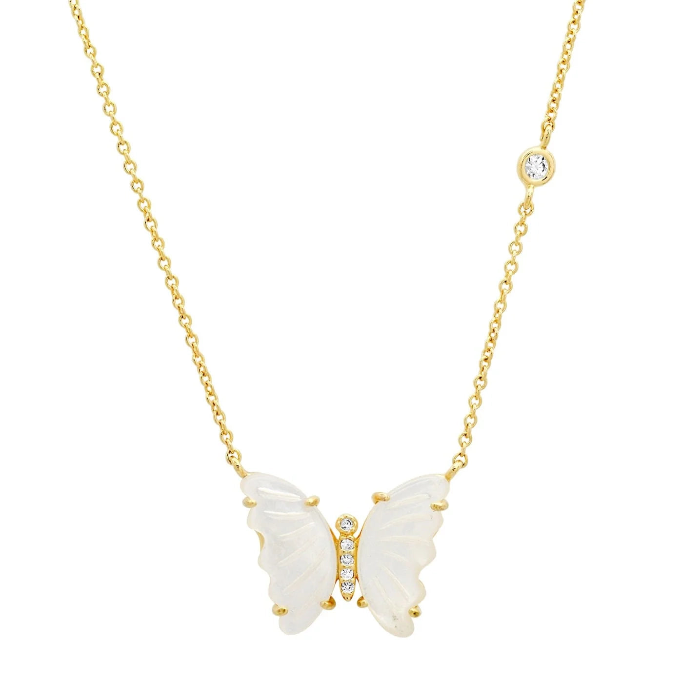 The Mother of Pearl Butterfly Necklace by Tai Jewelry is a testament to the brand's commitment to high-quality fashion jewelry with fine jewelry finishing. Born and raised in Bangkok, Thailand, Tai now operates from Los Angeles, creating pieces that are not only beautiful but also support the Thai artisan community. This pendant charm necklace can be worn alone or layered with other necklaces for a more dramatic effect. Enjoy the elegance and craftsmanship of this unique piece.