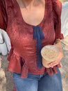 Effortlessly femme, this chic top features a classic scoop-neckline and puffy short-sleeves with contrast bow detailing and frilly ruffled hem.
