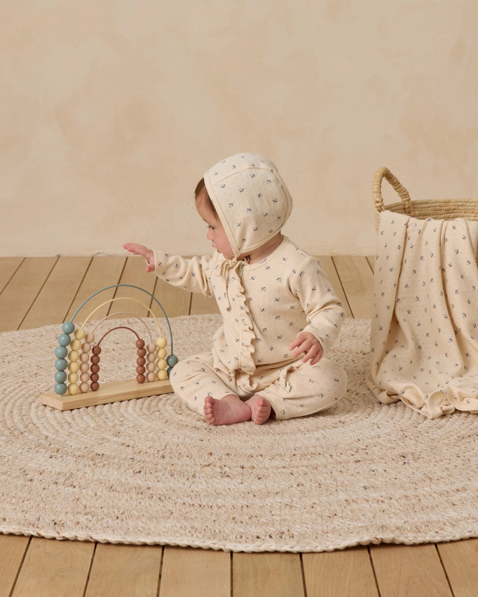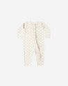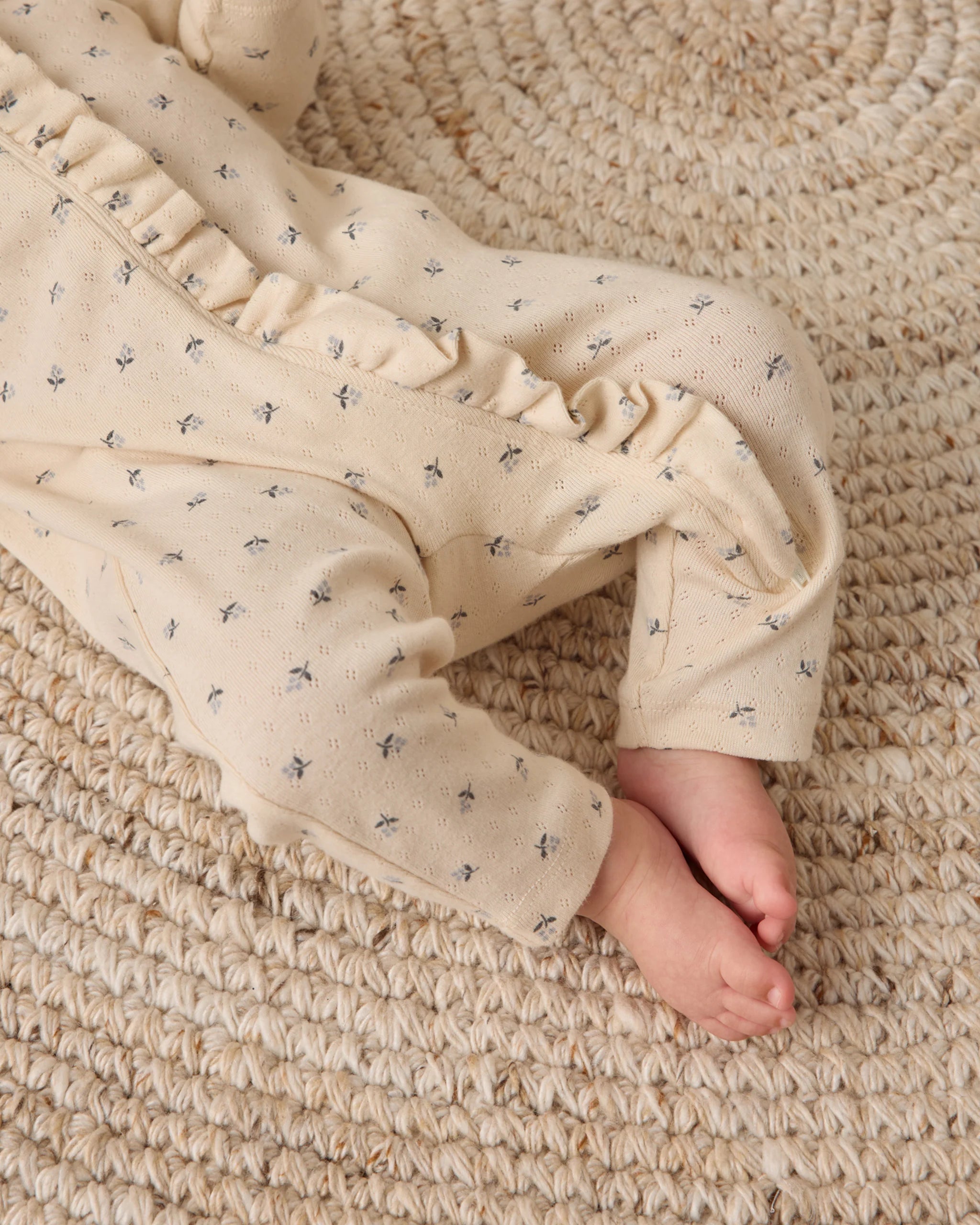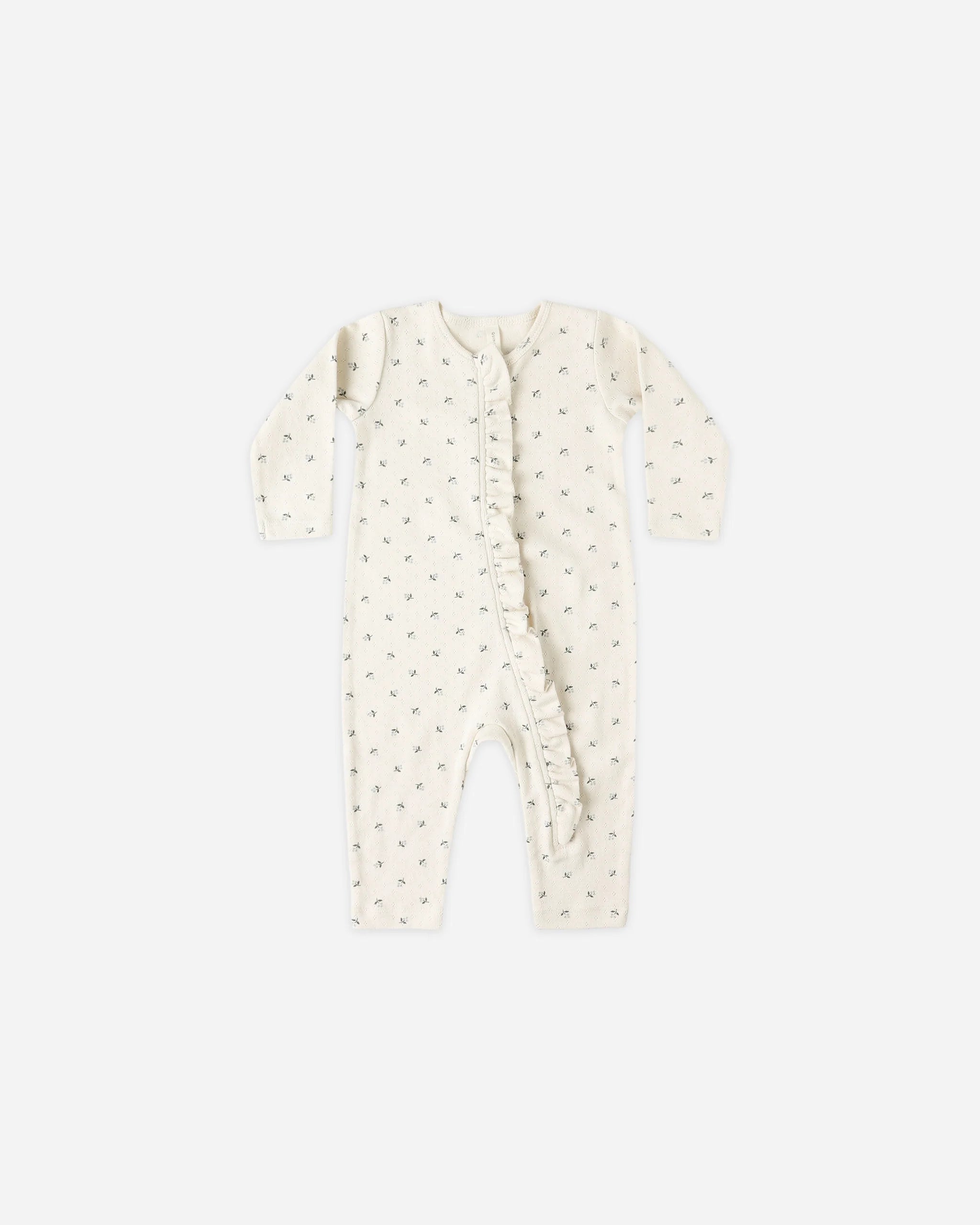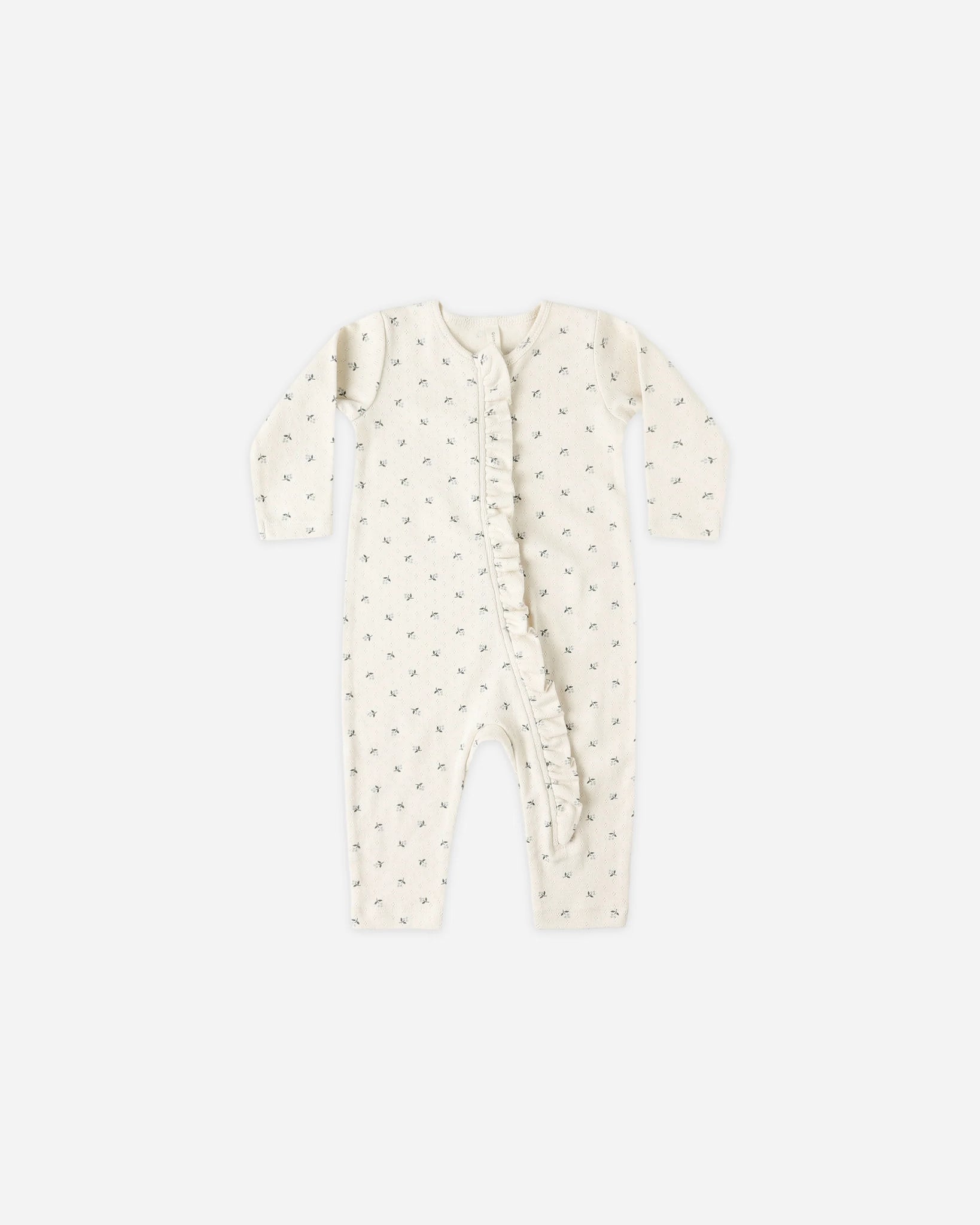 This sweet pointelle jumpsuit features delicate ruffle detail along the zipper, combining cozy comfort with timeless charm.