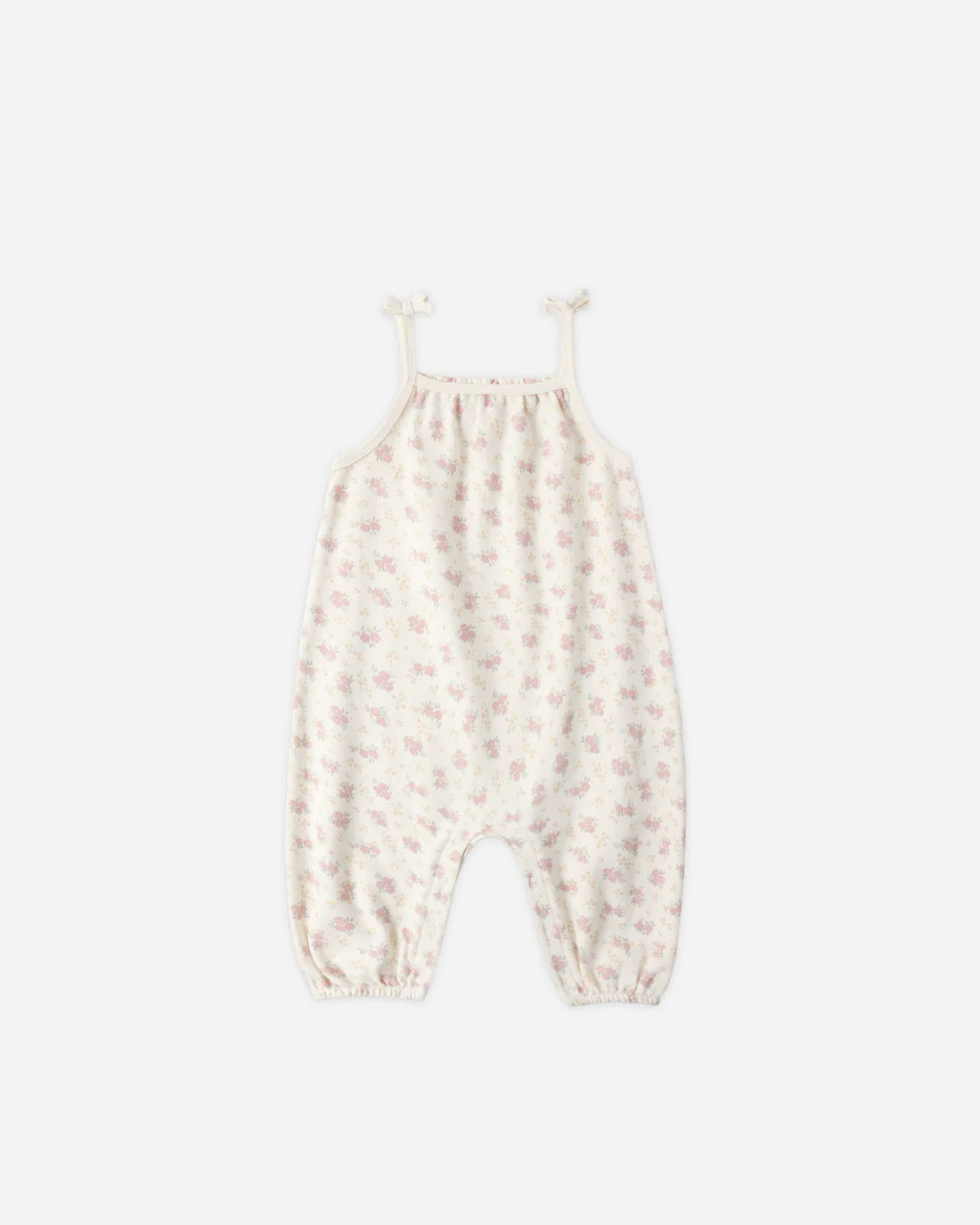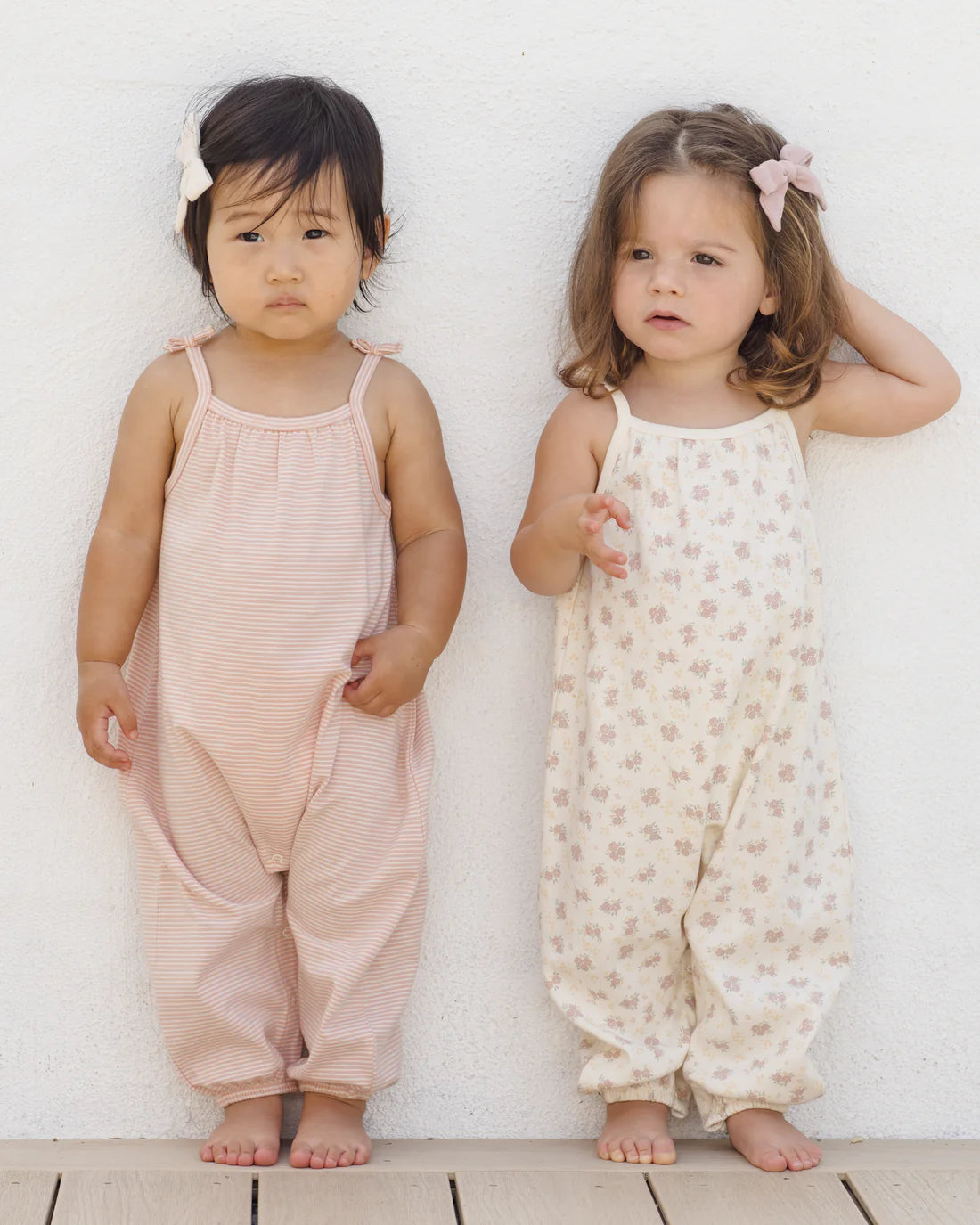 Spaghetti strap jumpsuit with fixed ties, a smocked back, elastic leg openings, and snaps down the inseam for easy changes - a go-to this season for your little one!