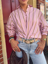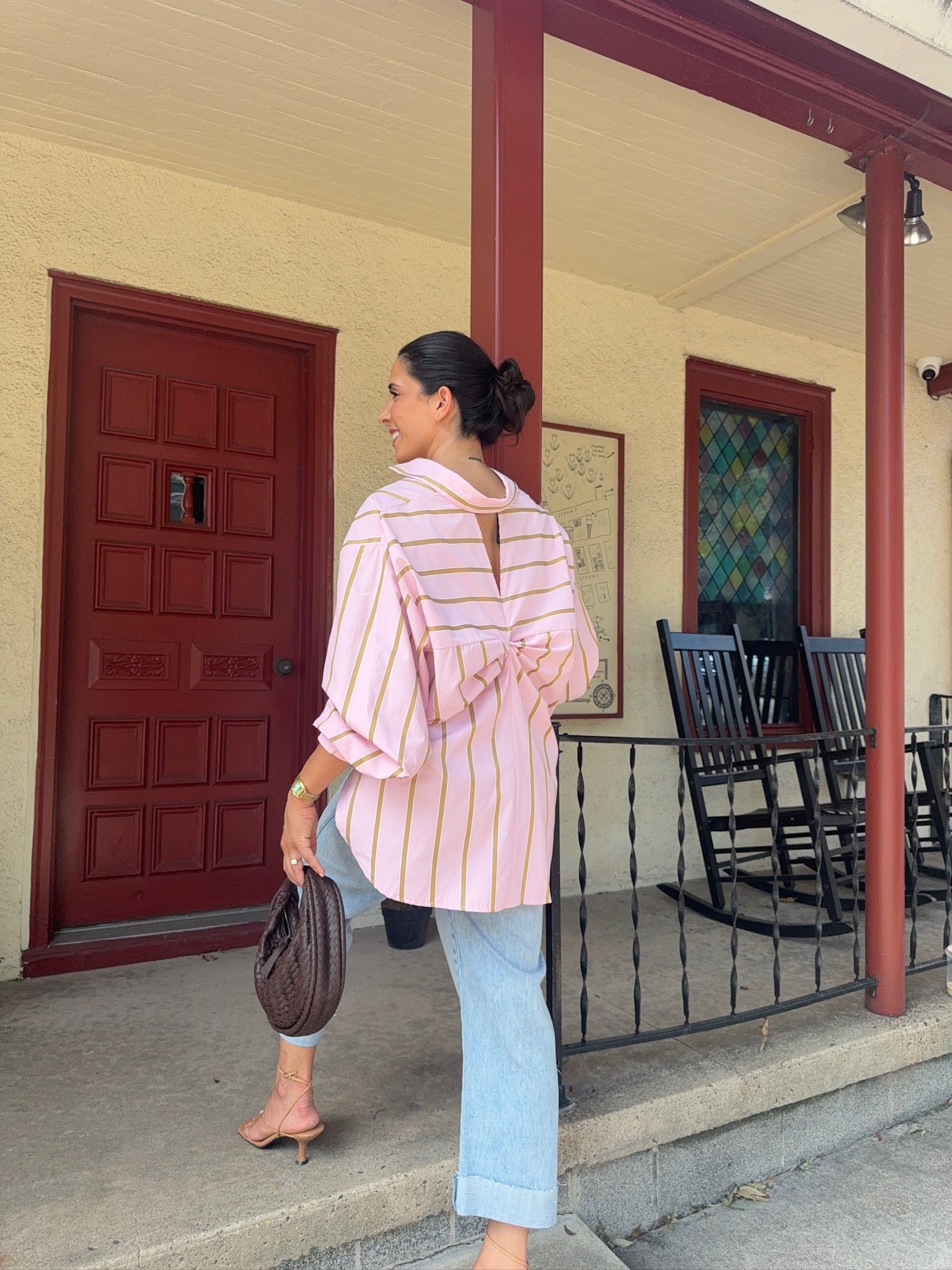 A striped oversized woven top featuring a shirt collar, button down, long sleeve, back cut out, and twist detail.