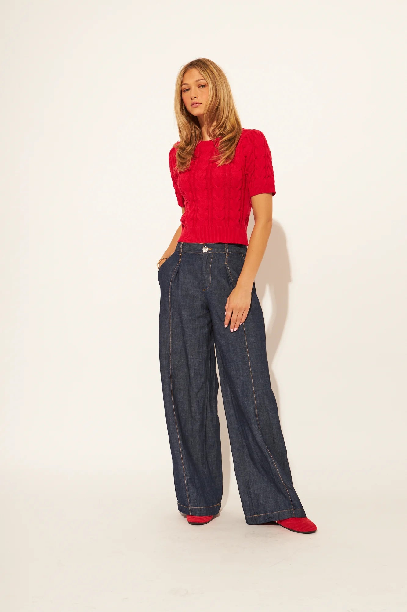 Crafted in a rich red cable knit, the Percy Sweater delivers timeless style with modern comfort. Features a classic crew neck and ribbed trim at the cuffs and hem for a polished finish. Short sleeves make it perfect for layering or wearing solo during transitional seasons. A versatile essential that pairs effortlessly with denim, trousers, or skirts for an elevated everyday look.