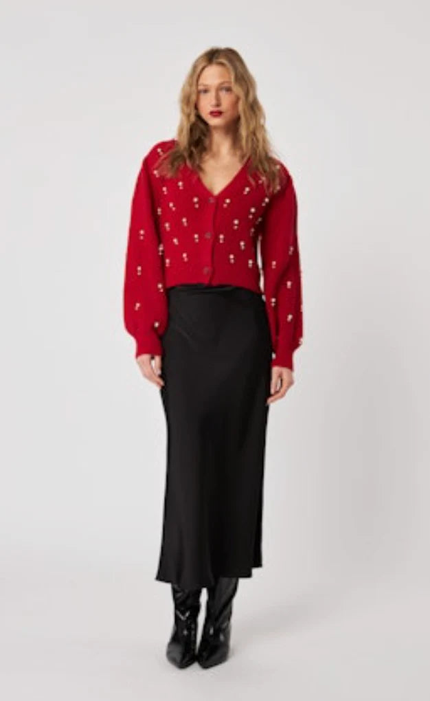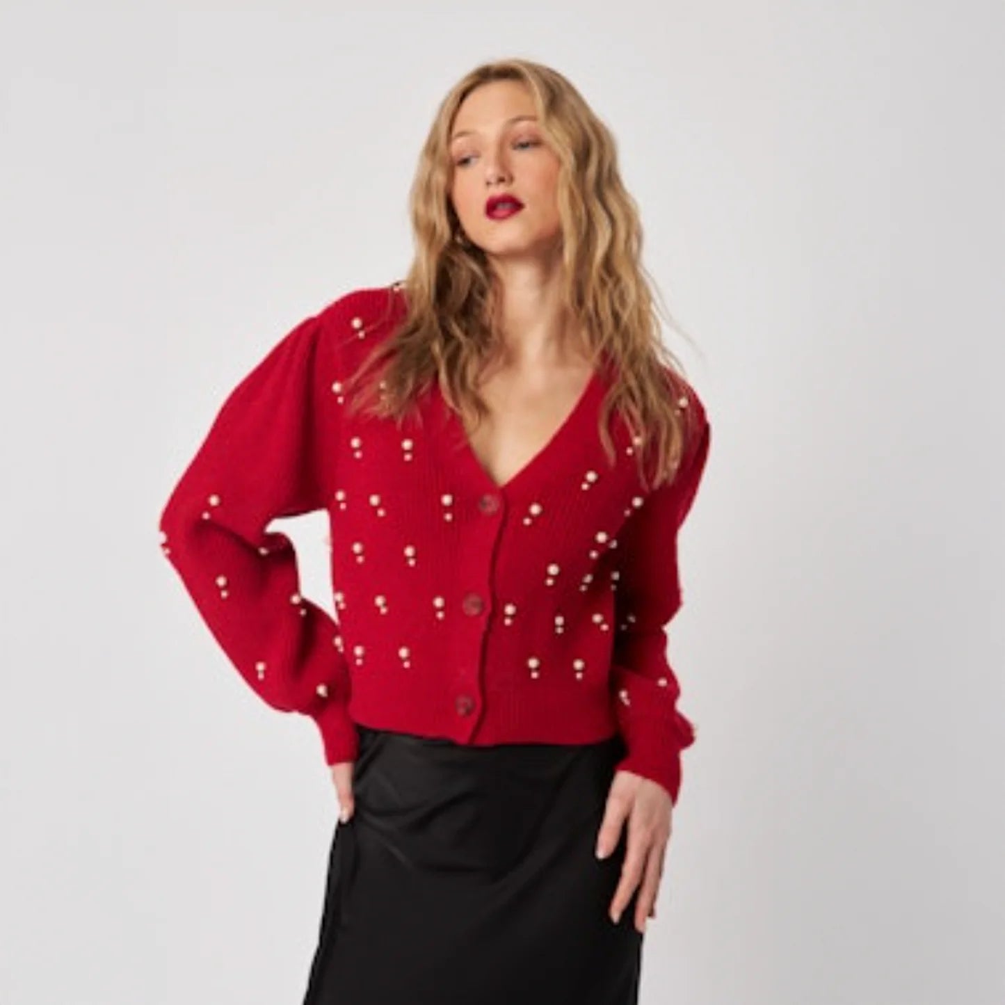 This playful V-neck cardigan returns in a fresh new hue, featuring voluminous balloon sleeves that add a fun, feminine touch. Adorned with delicate pearls, it brings a subtle sparkle to your outfit. The soft, plush knit and cropped silhouette create a flattering, on-trend look, perfect for pairing with high-waisted pieces. Whether layered or worn solo, this cardigan delivers cozy comfort with a chic twist that brightens any wardrobe.