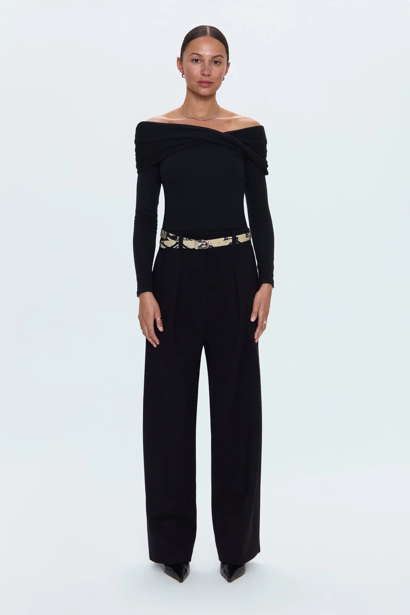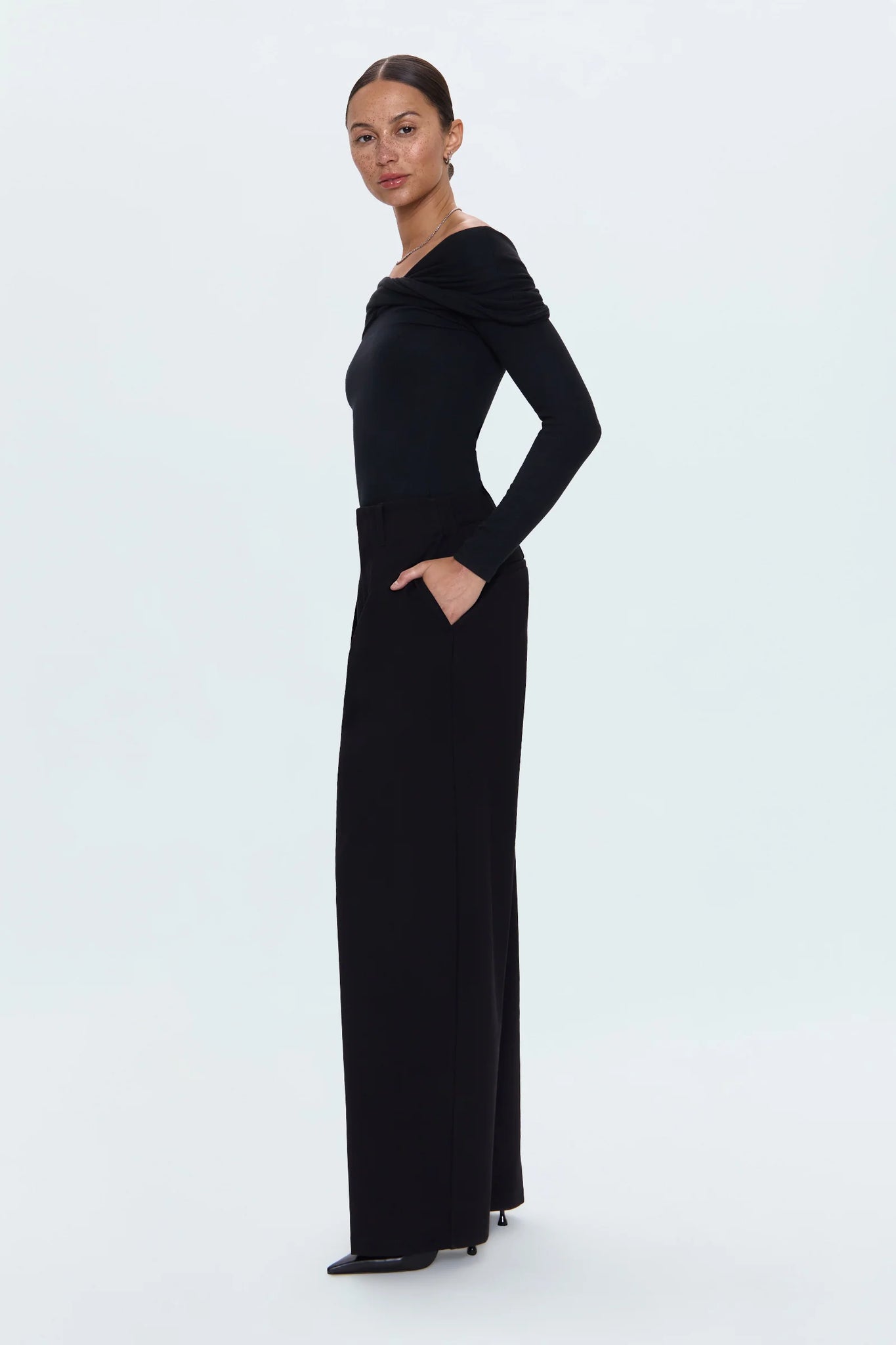 A tailored trouser, Eden features a high rise, sharp pleats, and a fluid wide leg for a modern take on classic tailoring. Cut from ponte fabric with subtle stretch, it balances structure and comfort for polished ease. Night Out, a deep black shade, offers timeless versatility from desk to dinner.