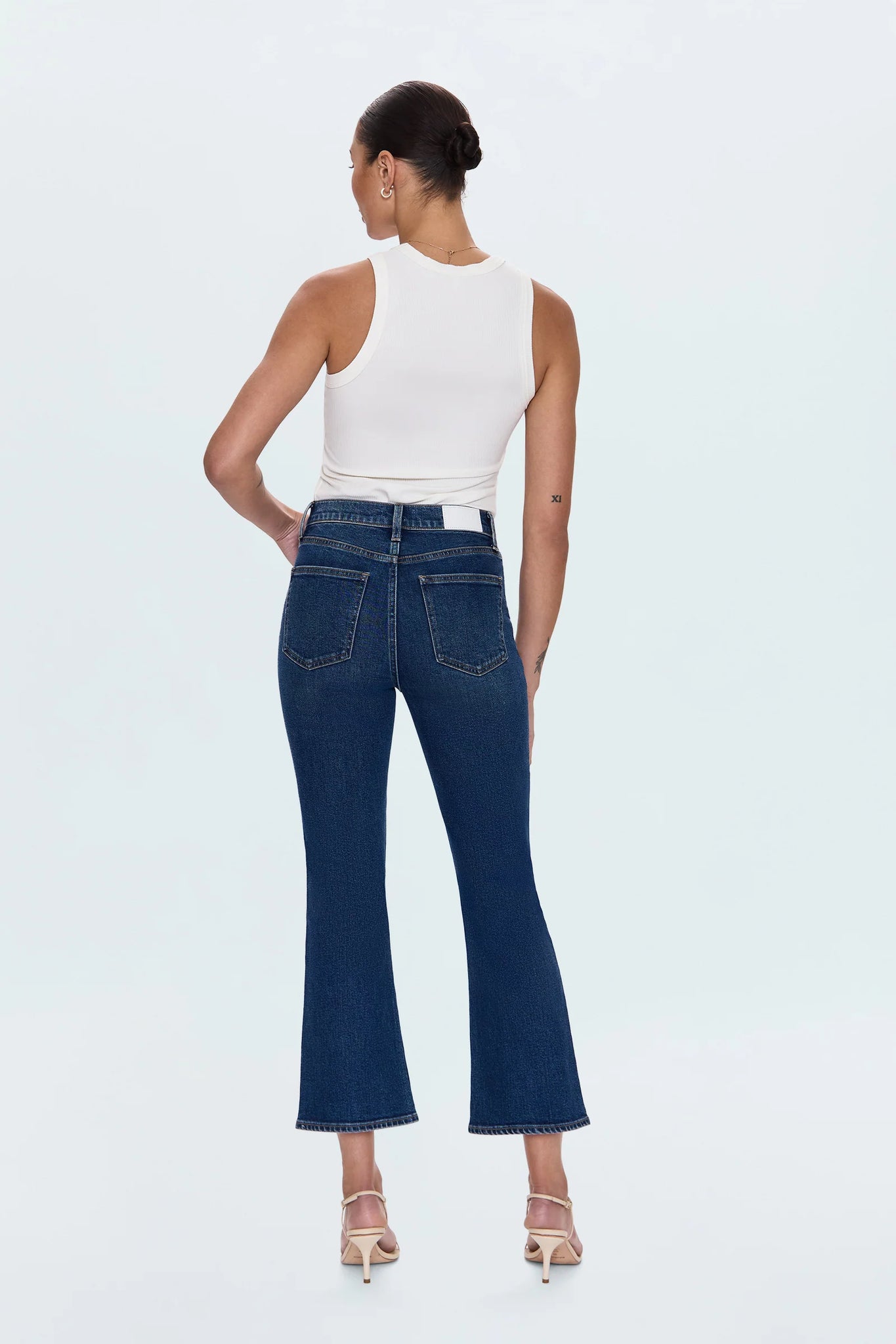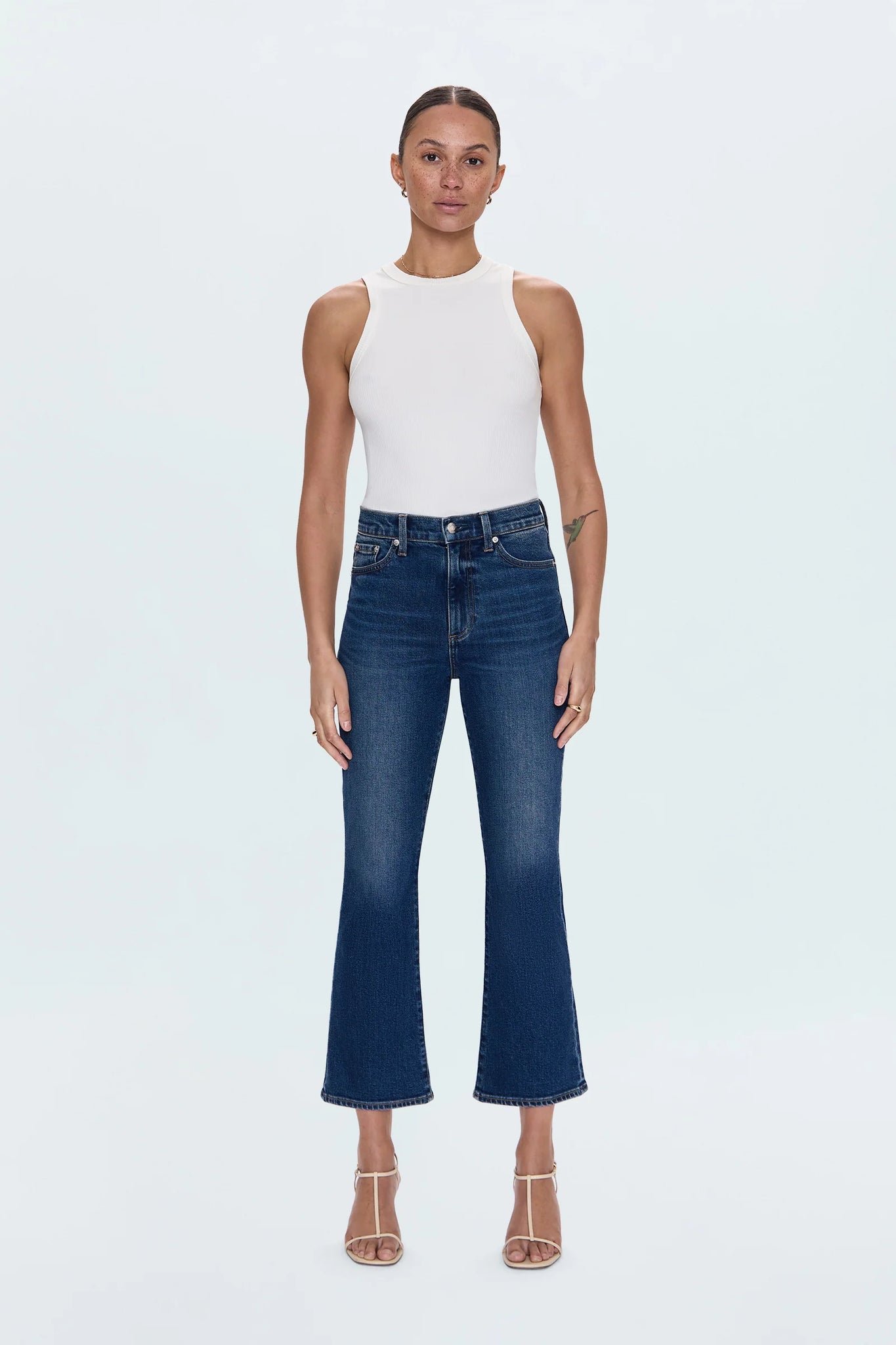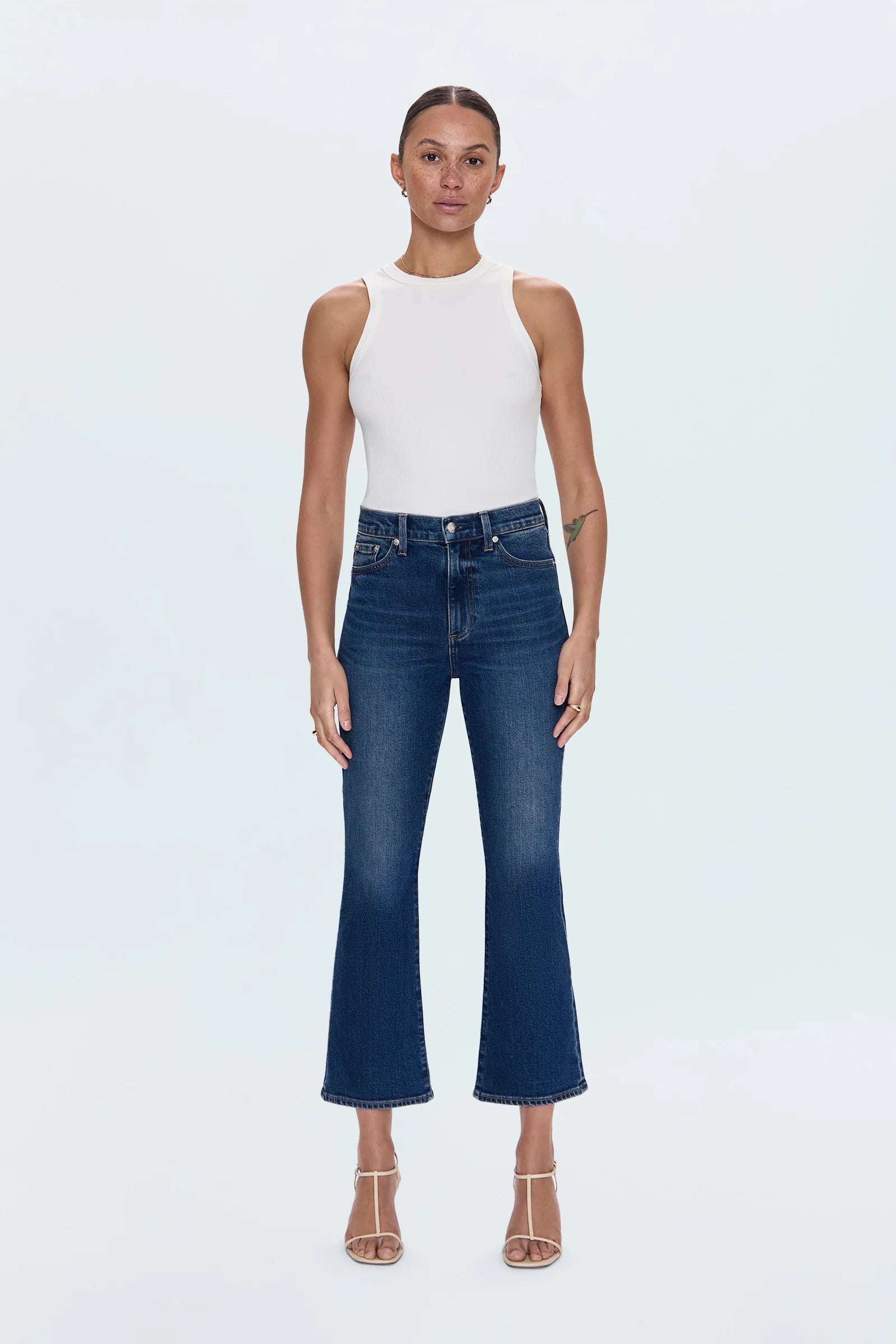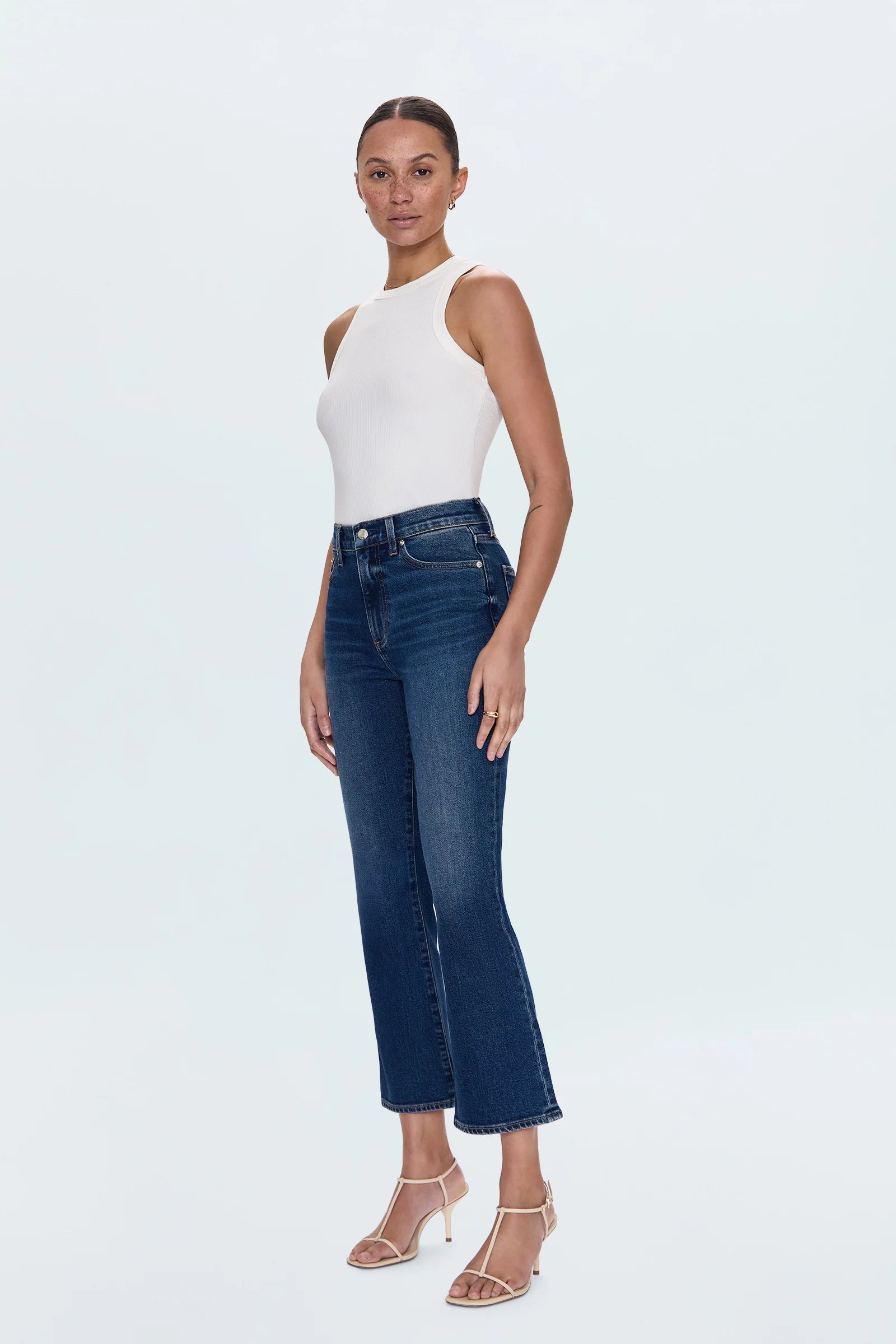 The bootcut you'll reach for again and again. Lennon sits at a high rise with a slim-to-the-body fit that hugs from hips to knee before flaring at the calf for perfect proportional effect. The cropped ankle bootcut creates a flattering silhouette that works with any shoe. Crafted from high stretch fabric that moves as you do while maintaining its expert shape. Broadway brings sophisticated depth with its dark wash, enhanced by subtle fading and whiskering that feels intentional, never overdone.